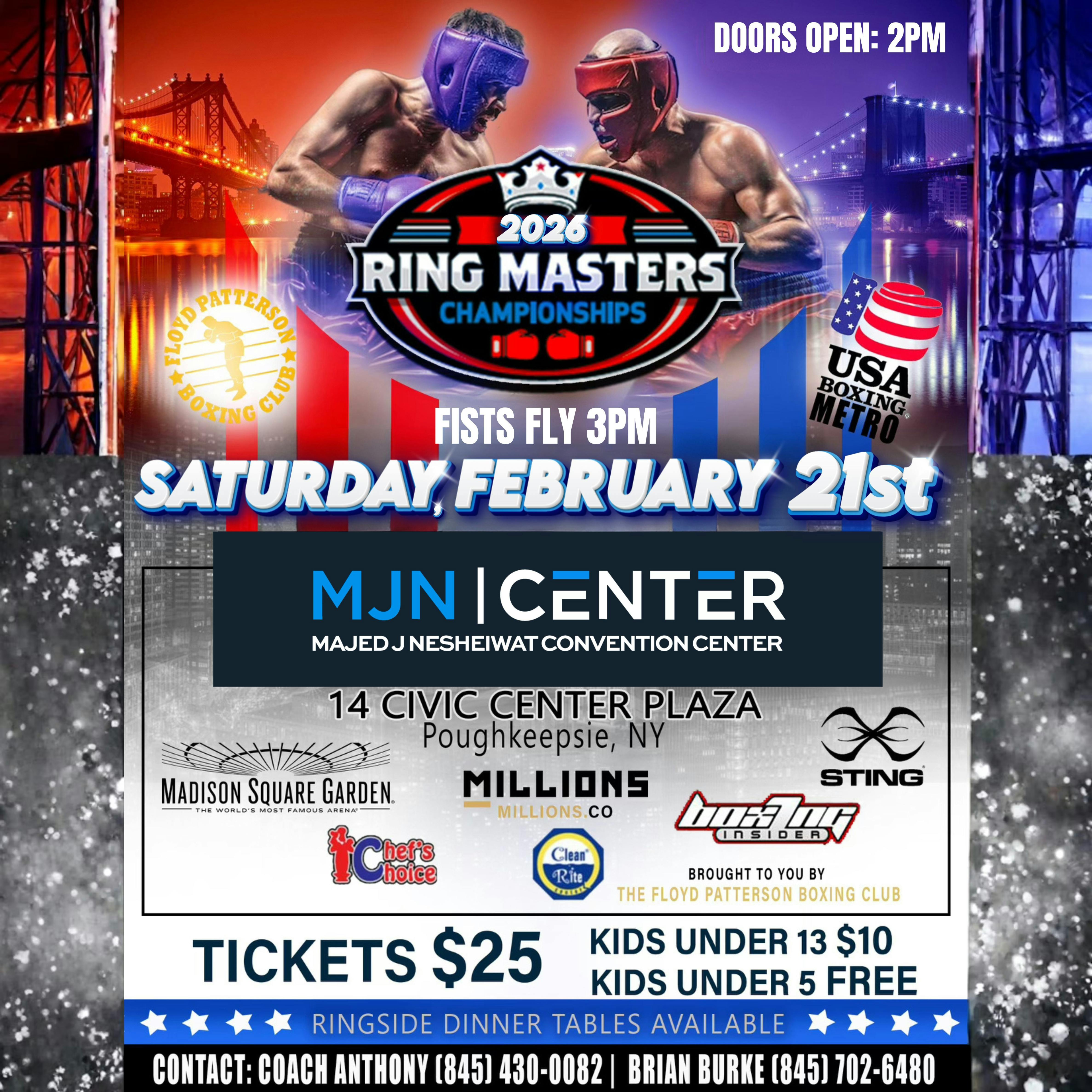 Ring Masters Championships, sponsored in part by Madison Square Garden and City Limits, launched in 2018 with record attendance and outstanding amateur boxing. The tournament includes males and females ages 8 on up and, except for Senior boxers (elite or novice), is open to any USA Boxing member. Floyd Patterson Boxing Club has competed over the last 6 years, and have produced 5 Ringmasters Champions, as well as several finalists. The Floyd Patterson Boxing Club has been hosting this event in the upstate area since the events conception and is proud to be bringing it to the MJN Center. A portion of this year's proceeds will be going towards the newly formed F.P.B.C After-school Program & Resource Center.